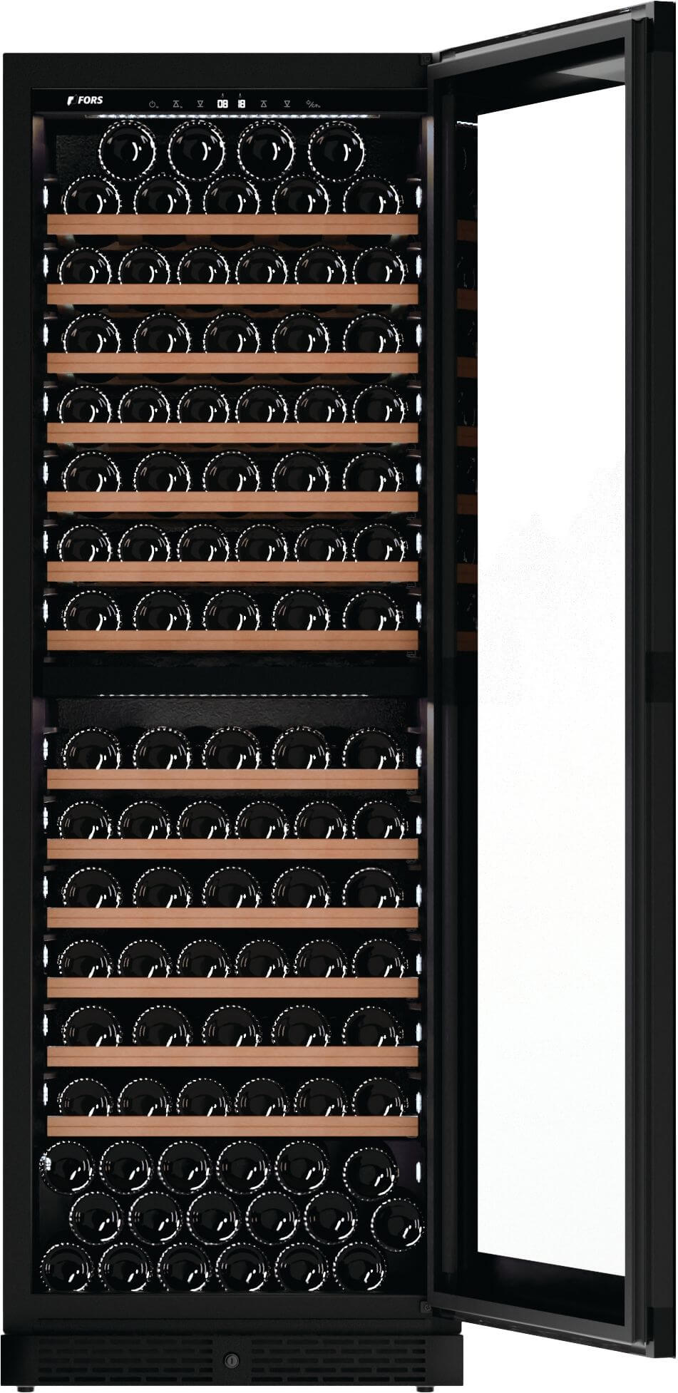 Marke: FORS, Weinkühlschrank freistehend FORS EXCLUSIVE, Stand/Einbau: Standgerät, Farbe: Schwarz, Türtyp: Isolierglastür; Rahmen schwarz, Türanschlag: Rechts wechselbar, Klimaklasse: SN-T, Jahresverbrauch Energie: 153 kWh, Geräuschwert: 38 dB(A) re 1 pW, Geräuschemissionsklasse: C, Steuerung: hinter der Tür; Touch-Elektronik, Display: digital; LC-Display monochrom, Kühlsystem Weinteil: dynamisch, Umluft, Temperaturbereich Weinteil: 5 °C – 20 °C, Anzahl Klimazonen: 2, Anzahl Ablagen: 14, Aktivkohlefilter, Nutzinhalt Gesamt: 379 l, Anzahl Weinflaschen: 152, Beleuchtung: Ja; LED-Deckenbeleuchtung pro Zone und LED-Seitenbeleuchtung beidseitig pro Holzbord in kaltweiss; warmweiss und hellblau (umschaltbar)