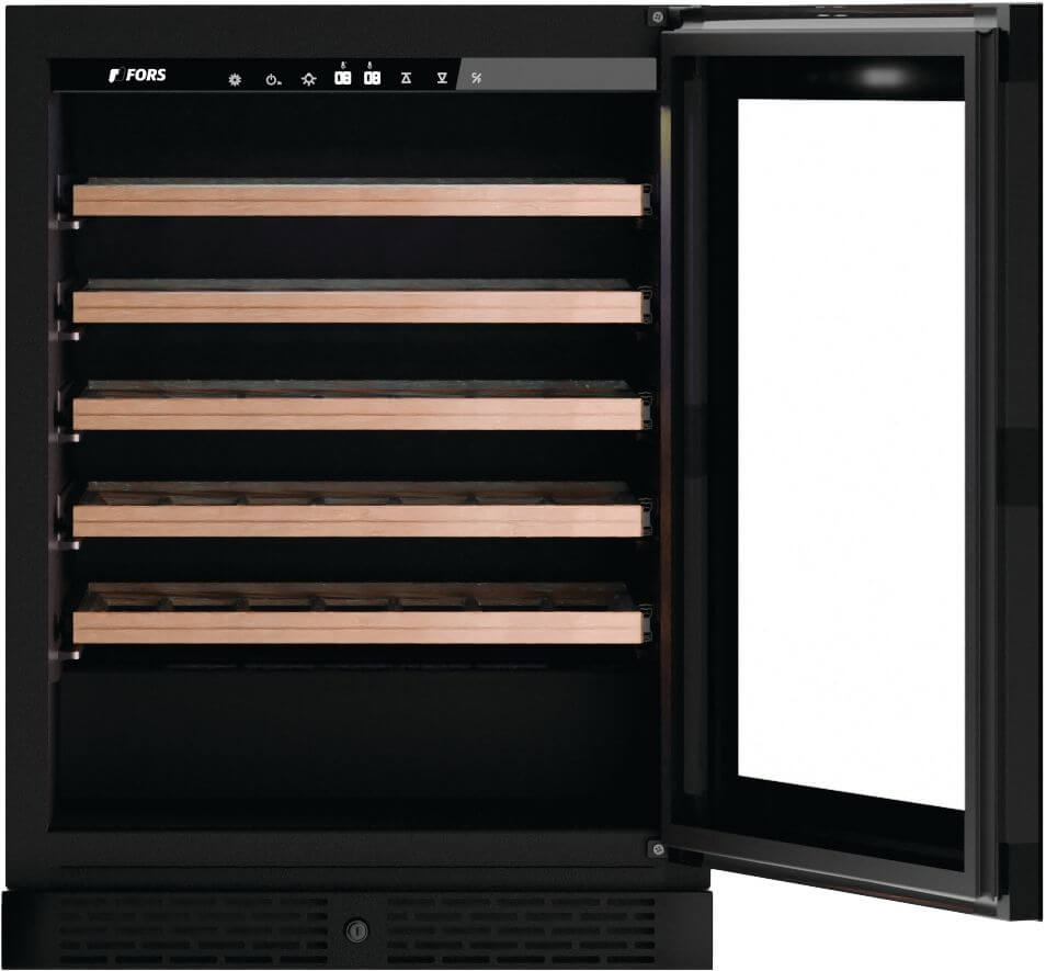 Marke: FORS, Weinkühlschrank freistehend FORS PREMIUM, Stand/Einbau: Standgerät, Farbe: Schwarz, Türtyp: Isolierglastür; Rahmen schwarz, Türanschlag: Rechts wechselbar, Klimaklasse: SN-T, Jahresverbrauch Energie: 104 kWh, Geräuschwert: 37 dB(A) re 1 pW, Geräuschemissionsklasse: C, Steuerung: hinter der Tür; Touch-Elektronik, Display: digital; LC-Display monochrom, Kühlsystem Weinteil: dynamisch, Umluft, Temperaturbereich Weinteil: 5 °C – 20 °C, Anzahl Klimazonen: 1, Anzahl Ablagen: 6, Aktivkohlefilter, Nutzinhalt Gesamt: 139 l, Anzahl Weinflaschen: 47, Beleuchtung: Ja; LED-Deckenbeleuchtung in kaltweiss